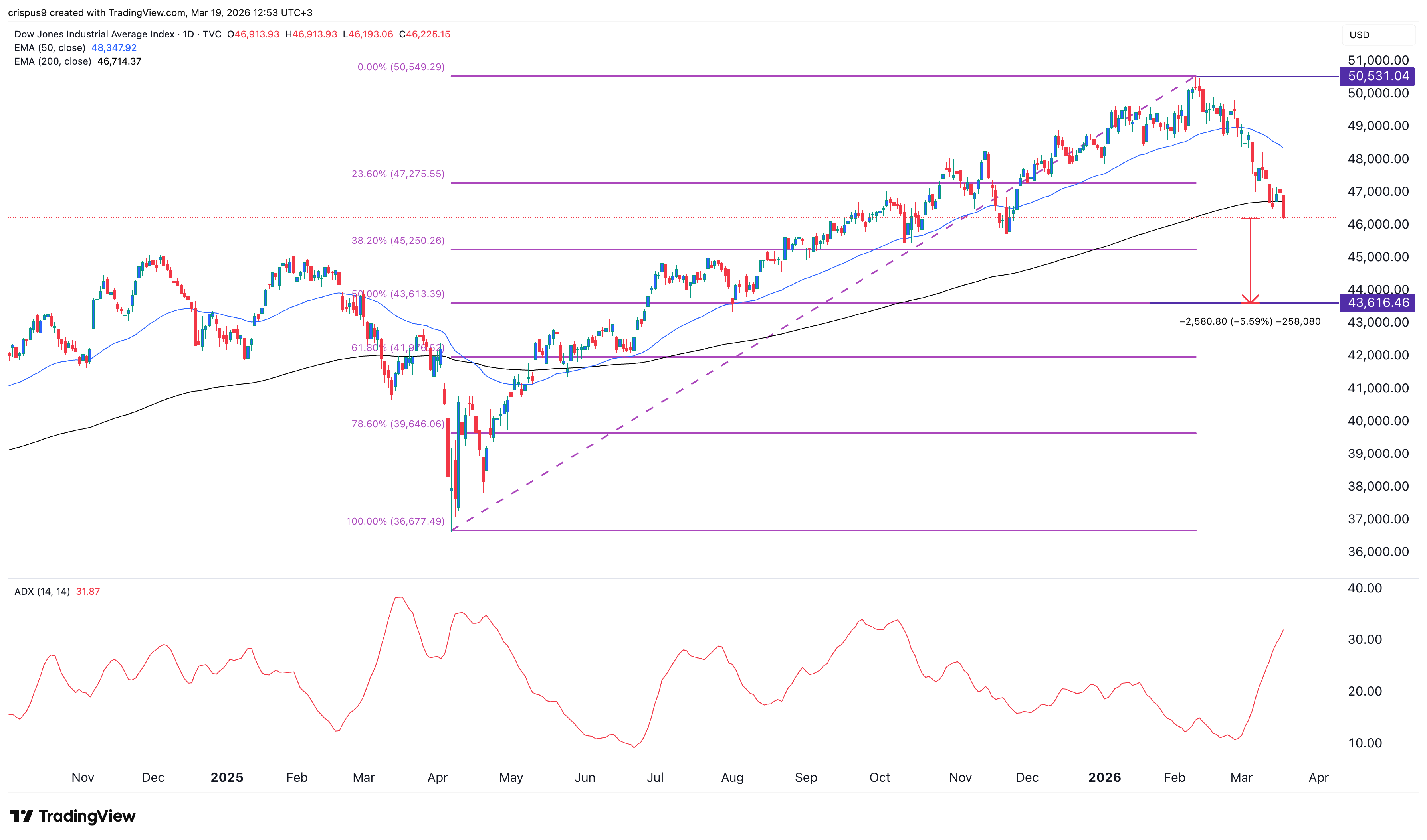 The daily chart reveals that the Dow Jones Index has crashed in the past few weeks, falling from the year-to-date high of $50,530 to the current $46,040.